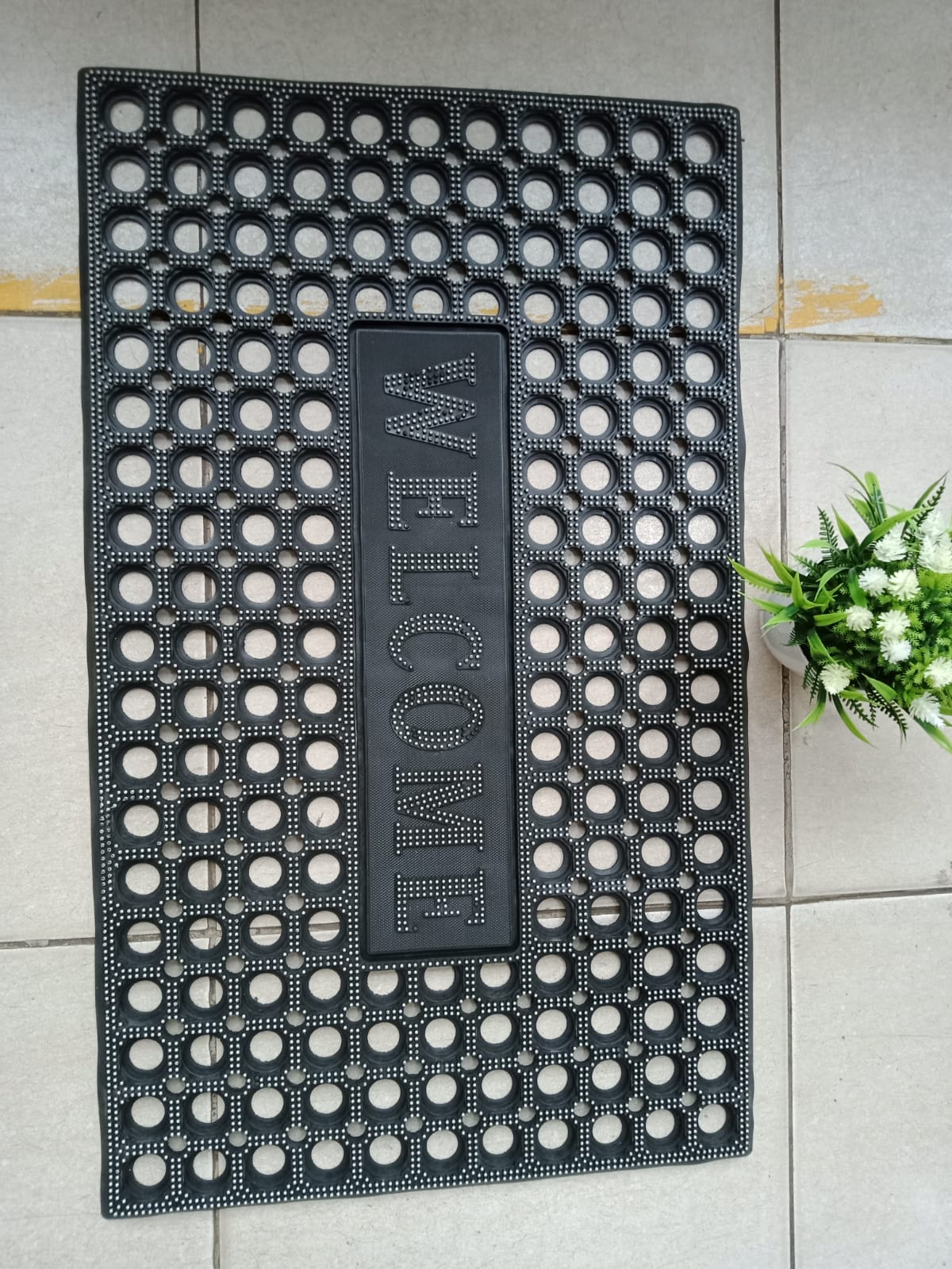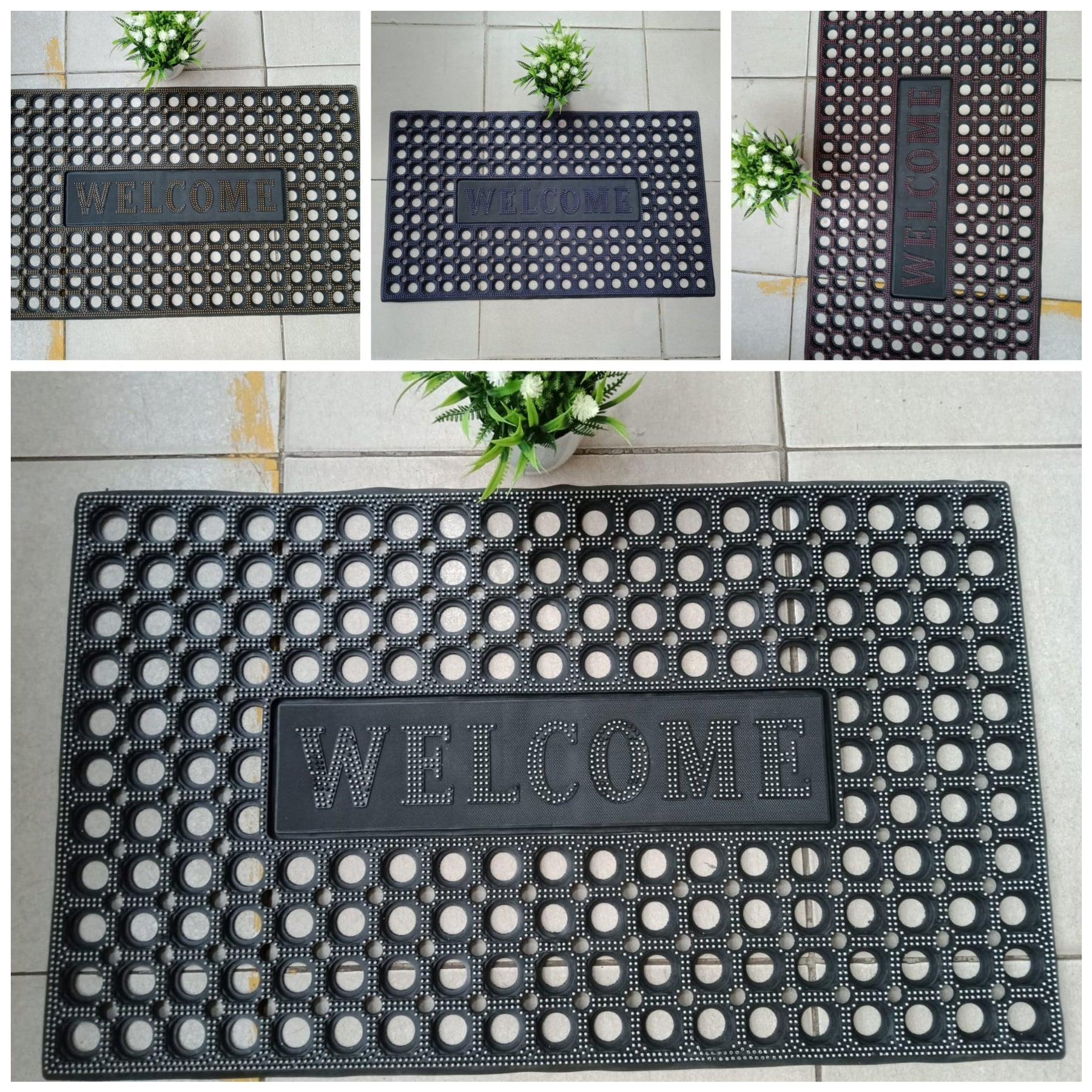 Velkomstoppe med tydelig tekst i midten. Teppets overflate har en strukturert utforming. Rektangulær form gjør at det passer foran inngangsdører. Oppen har kant rundt hele ytterflaten for stabil plassering.