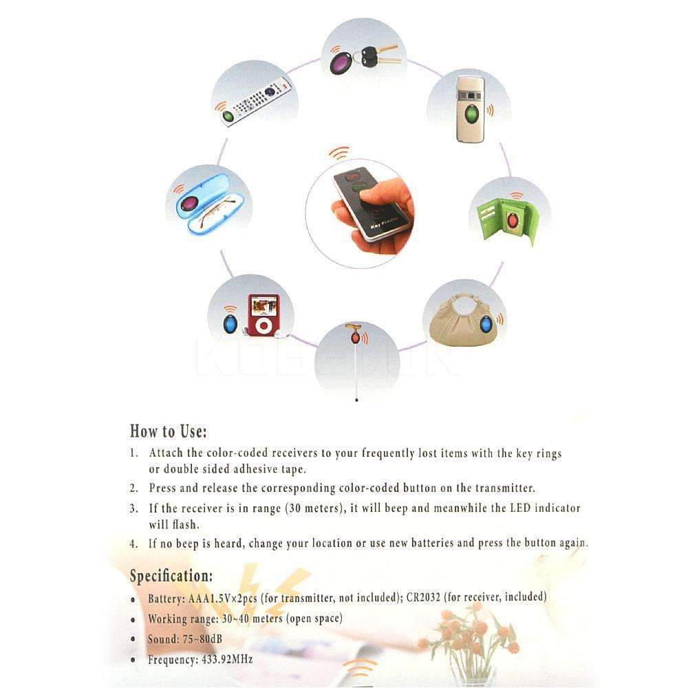 - Raskt finn tapte nøkler og andre lett bortkomne gjenstander med ett trykk på den fargekodede knappen, pipelyden og lysene vil hjelpe deg å finne dem.