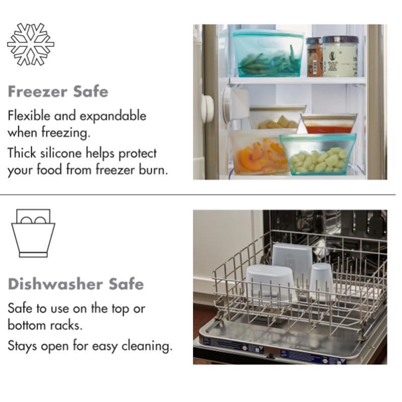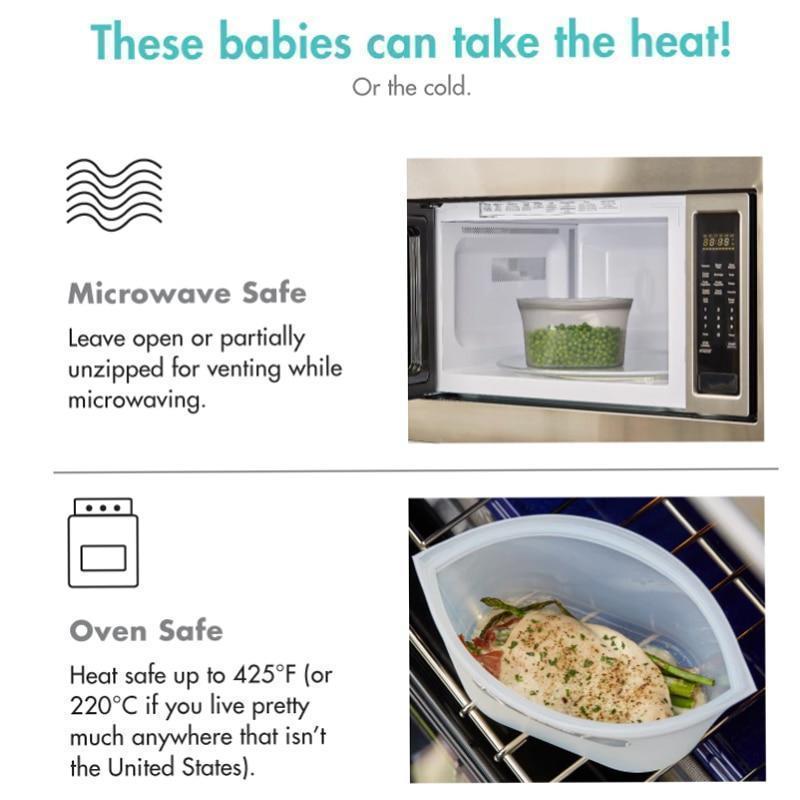 Oppbevar, tilbered og server maten i én og samme silikon gjenbrukbare glidelåsbag.