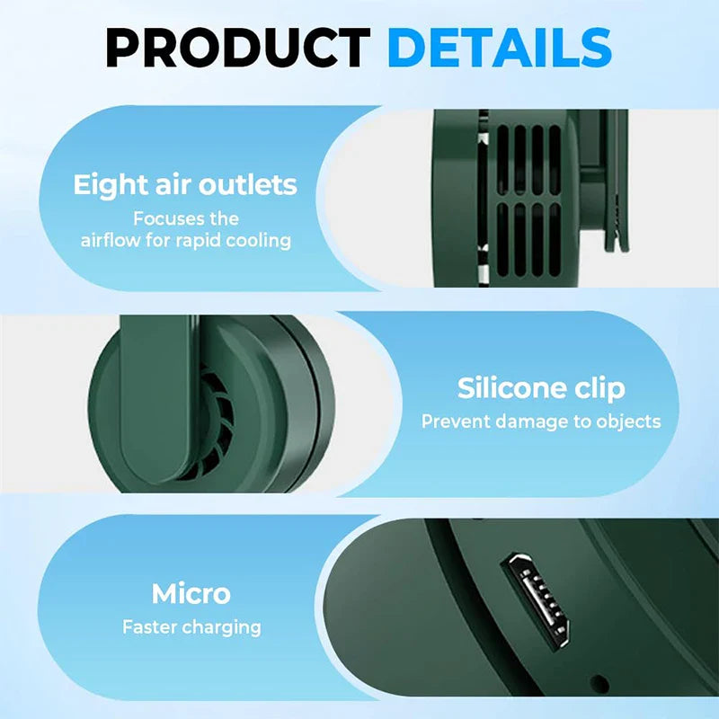 BreezeClip Mini Vifte er den geniale, bærbare løsningen for å beholde frisk luft på varme dager – stille, kompakt, og uten støtende blader. Med sitt smarte kleshenger-design kan den enkelt festes til klær, belter eller rundt nakken. Uansett om du pendler, jobber, går tur eller er på festival – med BreezeClip kan du alltid nyte en behagelig bris.