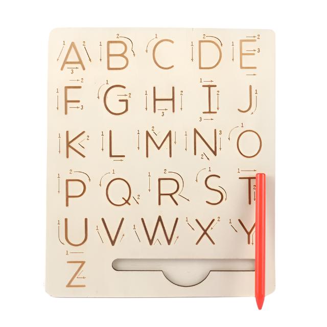 Å arbeide med bokstaver er en essensiell ferdighet som barn utvikler i førskolealderen. Vårt trealfabetbrett forvandler denne læringsreisen til en spennende opplevelse. Barna kan spore bokstavene med blyanten samtidig som de styrker sin hånd-øye-koordinasjon. Den dobbelsidige designen støtter øvelse med både store og små bokstaver.