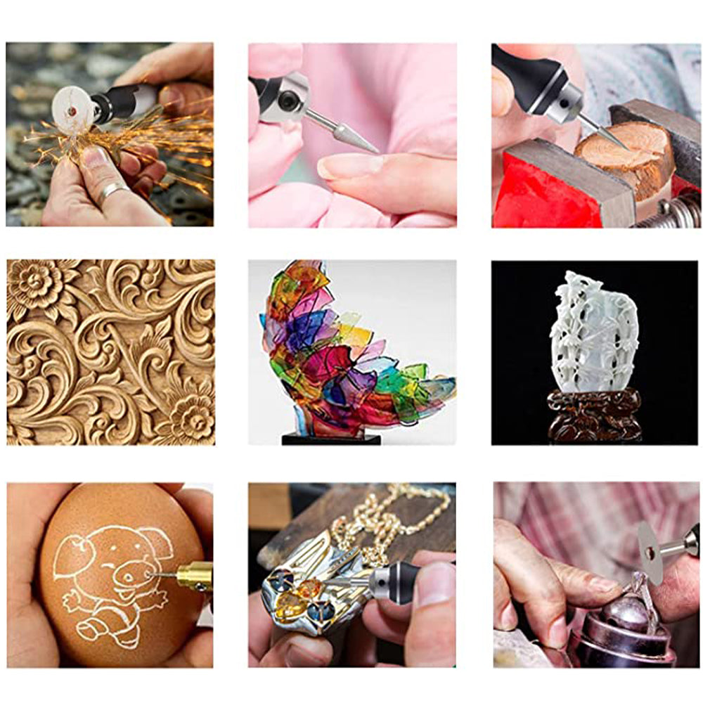 Dette etsingsverktøyet gir deg muligheten til å forbedre og grave i en rekke materialer, inkludert glass, tre, egg, plast, smykker, keramikk, lær, ringer, og mer. Det er egnet for gravering, sliping, polering, borings- og kutteoppgaver.