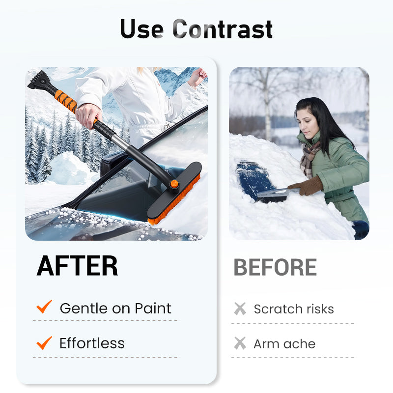 ✔️ 360° roterende børstehode for vanskelige områder: Børstehode kan justeres og låses i flere vinkler, noe som gjør det enkelt å fjerne snø og is fra alle sprekker og kanter på kjøretøyet ditt.