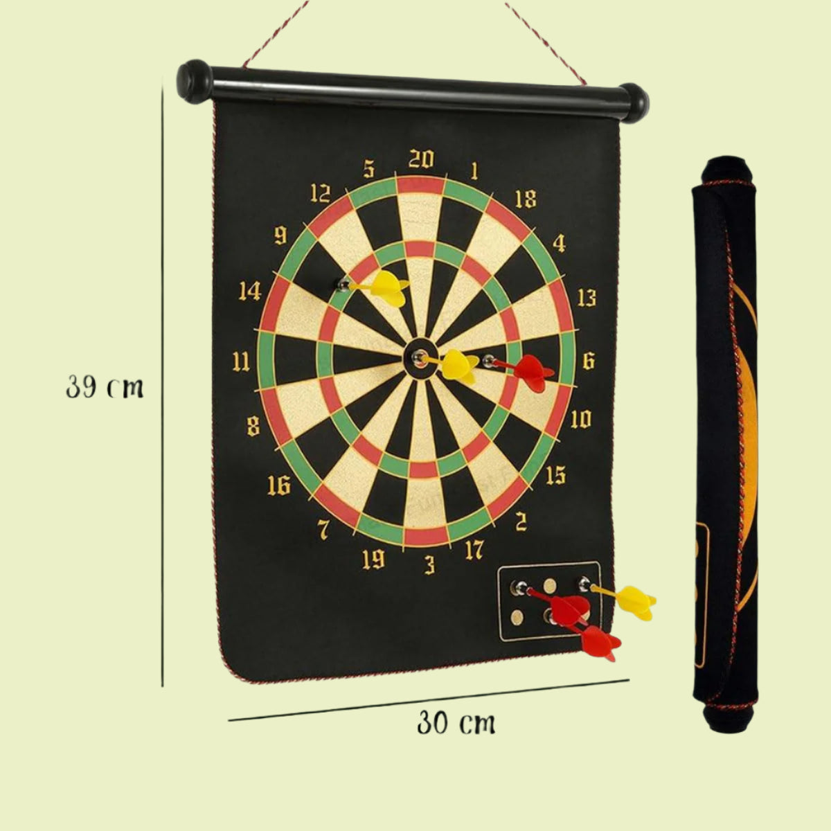 - Dobbeltsidig design: Den ene siden har et klassisk dartbrett, mens den andre siden byr på en Bull's Eye-utfordring.