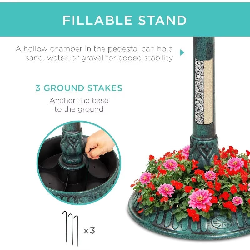 Med en hul sokkelkolonne kan dette fuglebadet med stativ fylles med sand eller vann for å øke stabiliteten, noe som sikrer at det står trygt selv på blåsende dager. Vær trygg på at ditt utendørs fuglebad forblir stabilt, slik at dine fjærkledde gjester kan føle seg komfortable og trygge.