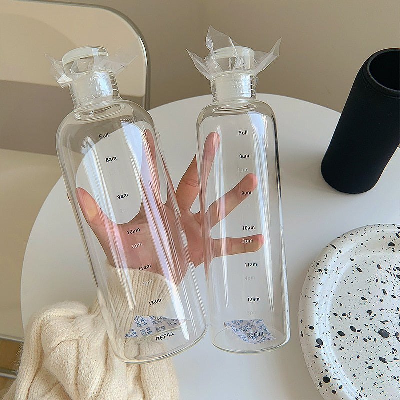 Keep track of your daily fluid intake with this stylish glass water bottle. It features a time indicator printed on the surface to help you achieve your hydration goals, and has a leak-proof lid that makes it easy to carry in your bag.